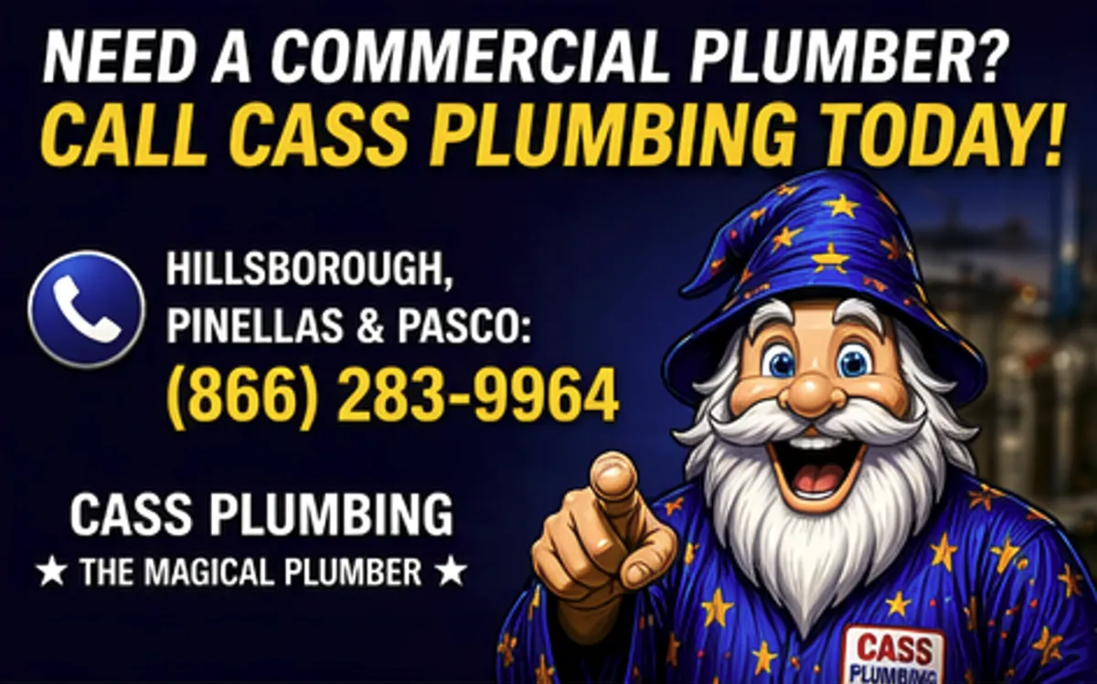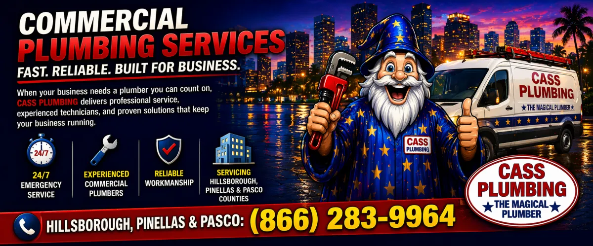 When your business needs dependable plumbing service, Cass Plumbing is ready to respond. We proudly provide professional commercial plumbing services for businesses, facilities, and commercial properties throughout Hillsborough, Pinellas, and Pasco Counties.